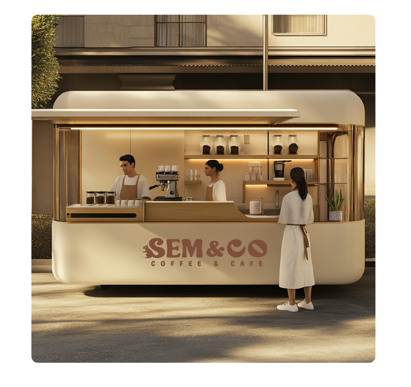 This illustration presents the kiosk concept for SEM & CO., designed to deliver an elegant yet functional setup for serving coffee on the go. The kiosk features a modern, streamlined design, blending natural materials like wood with soft neutral tones, creating a visually inviting and contemporary aesthetic. Equipped with a coffee machine and essential items such as cups and beans, the kiosk embodies both practicality and style. The SEM & CO. logo is prominently displayed at the front, reinforcing brand visibility and identity. The setup accommodates baristas working efficiently behind the counter, ensuring a smooth, customer-friendly service experience. The design emphasizes clean lines, simplicity, and a welcoming atmosphere, making it ideal for outdoor locations, busy streets, or pop-up events.